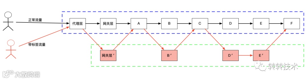 全链路压测:流量无区分,影响线上用户,只能在业务低峰进行压测,需要值守,成本较高,需要能够流量隔离,随时可以进行压测。