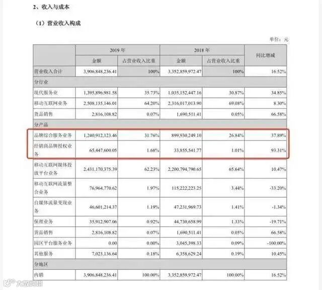 而在营业收入构成中, 31.76%为品牌综合服务业务,金额约为12.4亿元;1.68%为经销商品牌授权业务,金额约0.65亿元。品牌授权相关营收合计约为13亿元,因而被业内称为靠“卖商标”一年收入13亿元。
