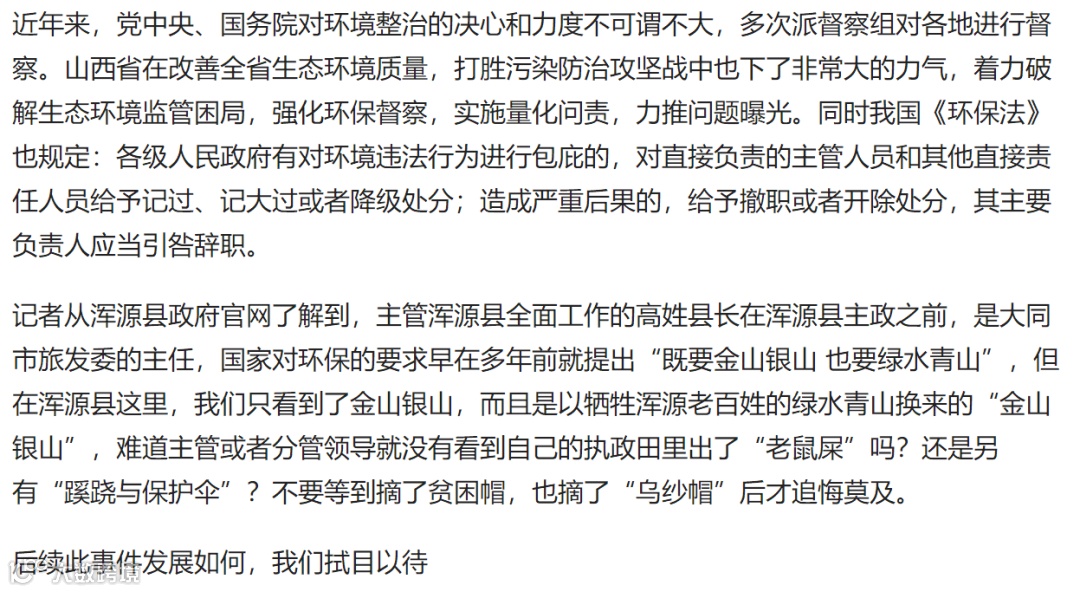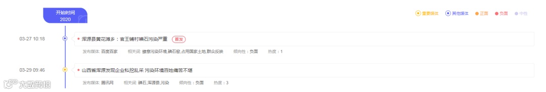 本次事件首发文章《浑源县黄花滩乡:官王铺村碘石污染严重》,倾向性为负面,共监测到4条信息,《山西省浑源发现企业私挖乱采 污染环境百姓痛苦不堪》是网络传播最集中的议题和重点,新闻类媒体是本次事件的主要传播渠道。建议持续追踪事件传播趋势,及时发现在传播过程中的问题,为处理问题提供数据依据。