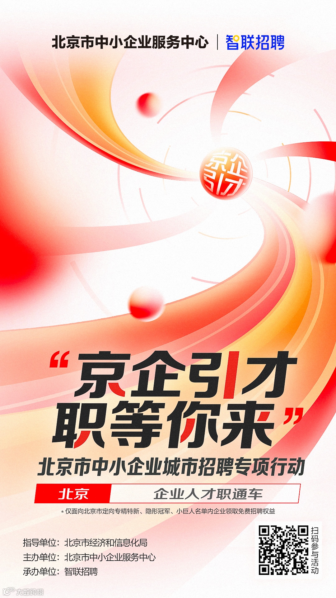 为了进一步契合不同区域中小企业人才需求,结合北京市“2441”高精尖产业体系特点,洞察企业核心技术人才短缺、复合型人才储备不足、人才引进与留用机制待完善等挑战,打造“京企引才,职等你来——北京市中小企业城市招聘专项行动”,帮助中小企业快速找到契合发展战略的高校人才和社会人才,推动企业创新发展。
