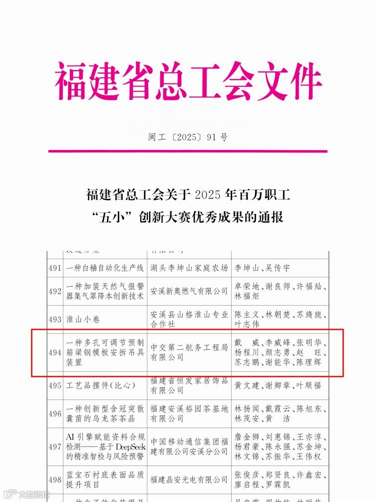 近日,安溪国道G358项目申报的“一种多孔可调节预制箱梁钢模板安拆吊具装置”成果获福建省“五小”创新大赛三等奖。