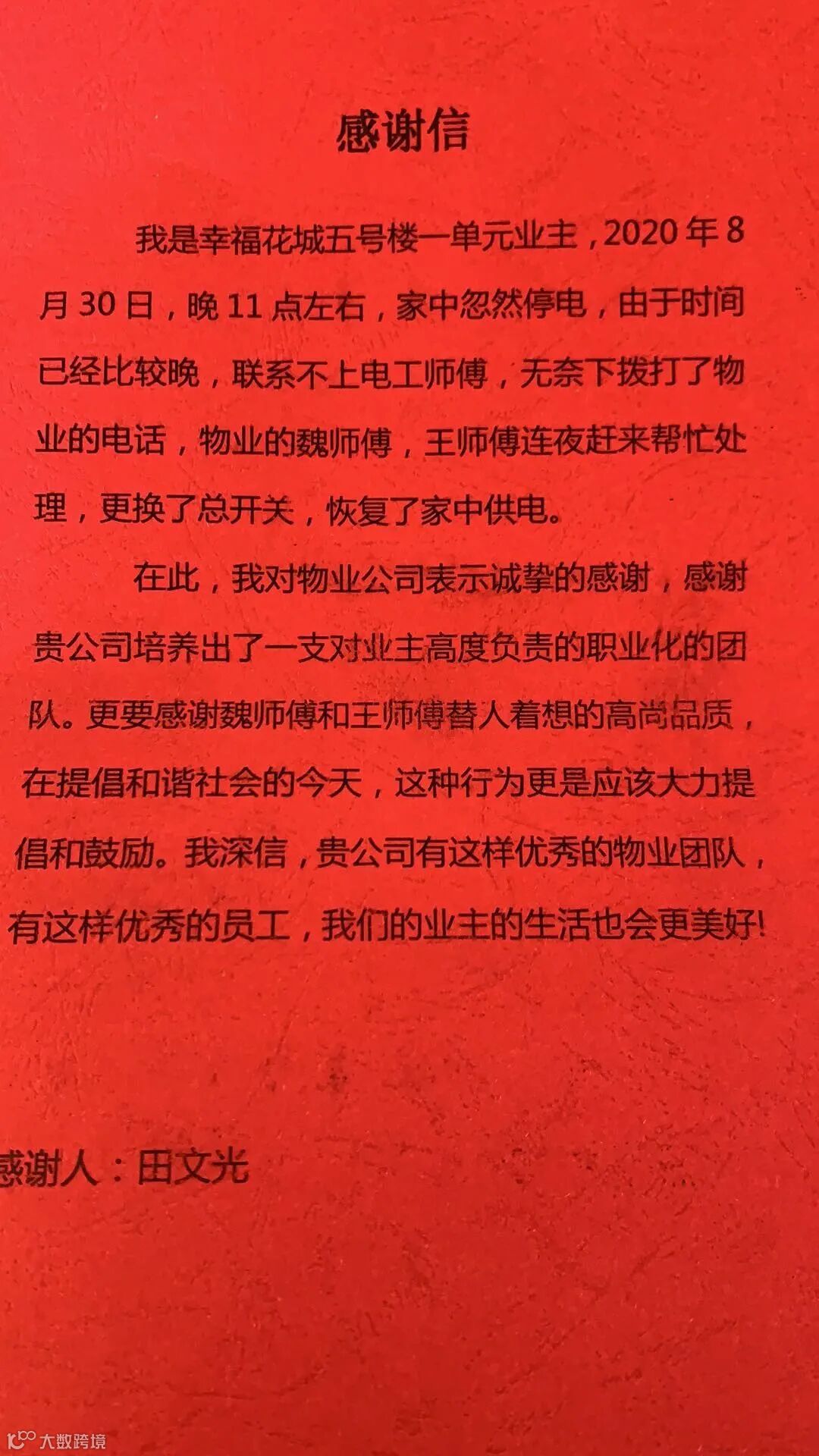 2020年9月,森沃幸福花城物业服务中心收到了业主送来的一封感谢信,这封感谢信代表对物业一直以来尽心尽责的服务表示由衷的肯定和诚挚的谢意。