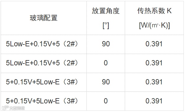 可见,复合真空玻璃竖向放置和水平放置时,K值也保持不变。
