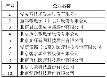 北京市专精特新企业累计发明专利前10 企业专利均超300项,名单如下: