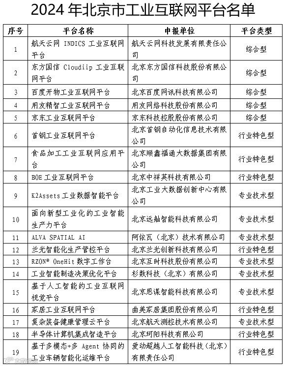 经企业自主申报、资料审查、专家评审、公示等环节,确定了2024年北京市工业互联网平台名单,其中综合型5家、行业特色型和专业技术型各7家,现予以正式公布(详见附件)。