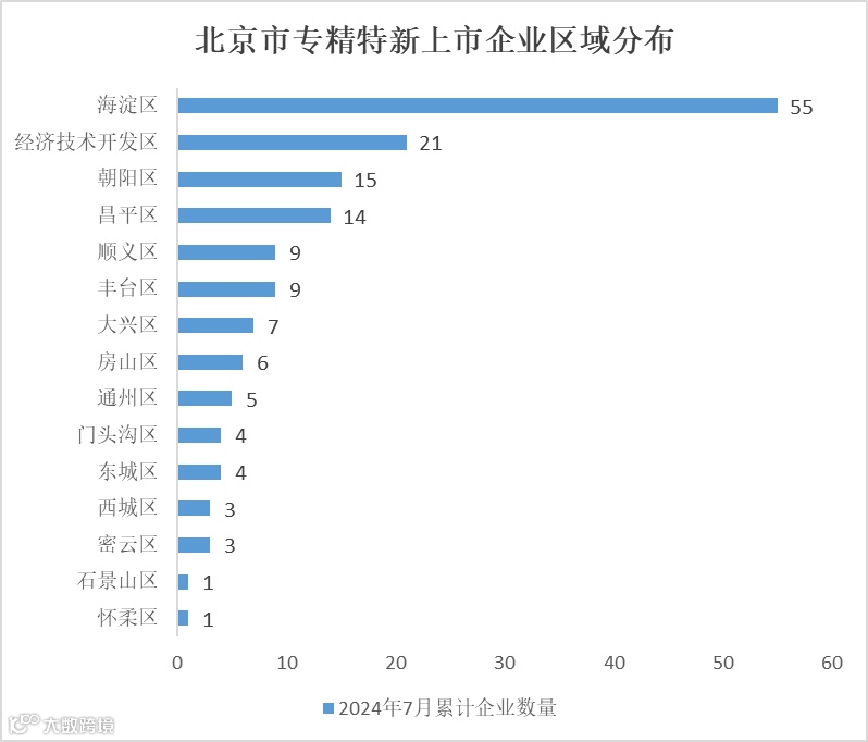截至2024年7月底,北京上市企业共467家,其中专精特新企业157家,占北京市上市企业的33.62%,占专精特新比例为1.79%。专精特新上市企业主板32家、创业板58家、科创板47家、北交所20家,分别占比20.38%、36.94%、29.94%、12.74%。海淀区上市的专精特新企业最多,达55家,占比35.03%,经济技术开发区21家,朝阳区15家。从产业分布看,上市专精特新企业集中在新一代信息技术产业、软件和信息技术服务业产业、人工智能产业,与上月一致。截至2024年7月底,上市的专精特新企业市值总额达8079.43亿元,企业平均市值为51.46亿元/家。