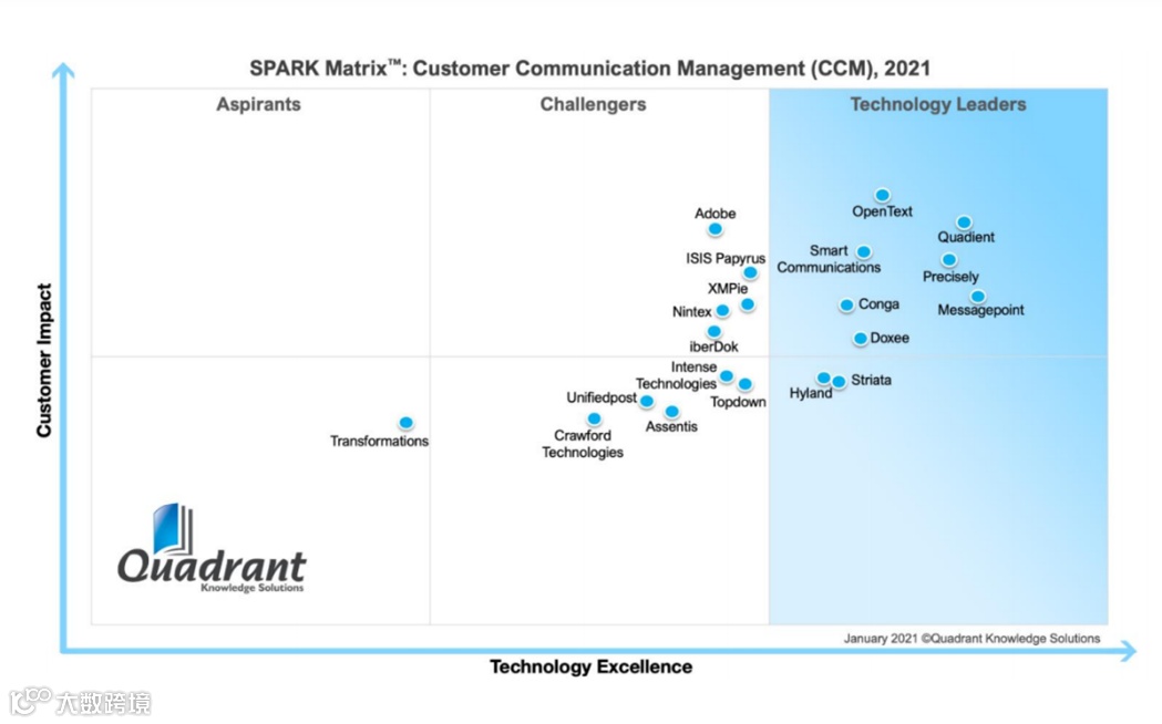 东京奥运会上,中国代表队凭借傲人的实力占据奖牌榜的前列。在CCM赛道上,Quadient的实力也有目共瞩,根据Quadrant Knowledge Solutions 的最新评估,Quadient在技术优势和客户影响上超越了大多数客户沟通管理供应商,被评为CCM市场的技术领导者。