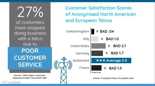 最新调研数据显示,电信行业用户流失率仍居高不下,用户满意度在九大传统行业中排名垫底(包括旅游、传媒、零售、金融、汽车等),27%用户因不满客服质量而中止订单。