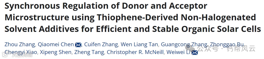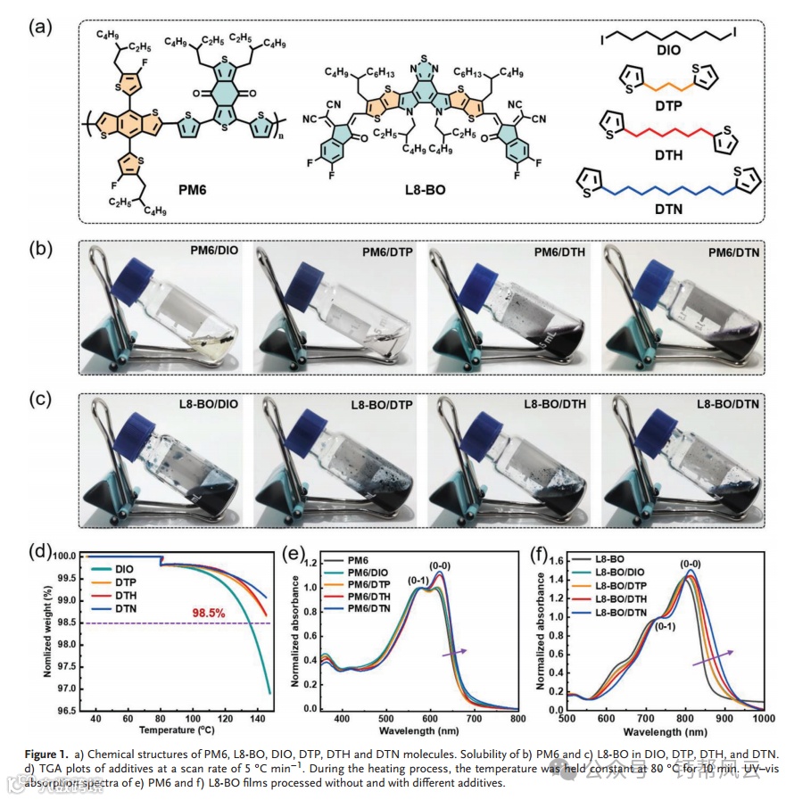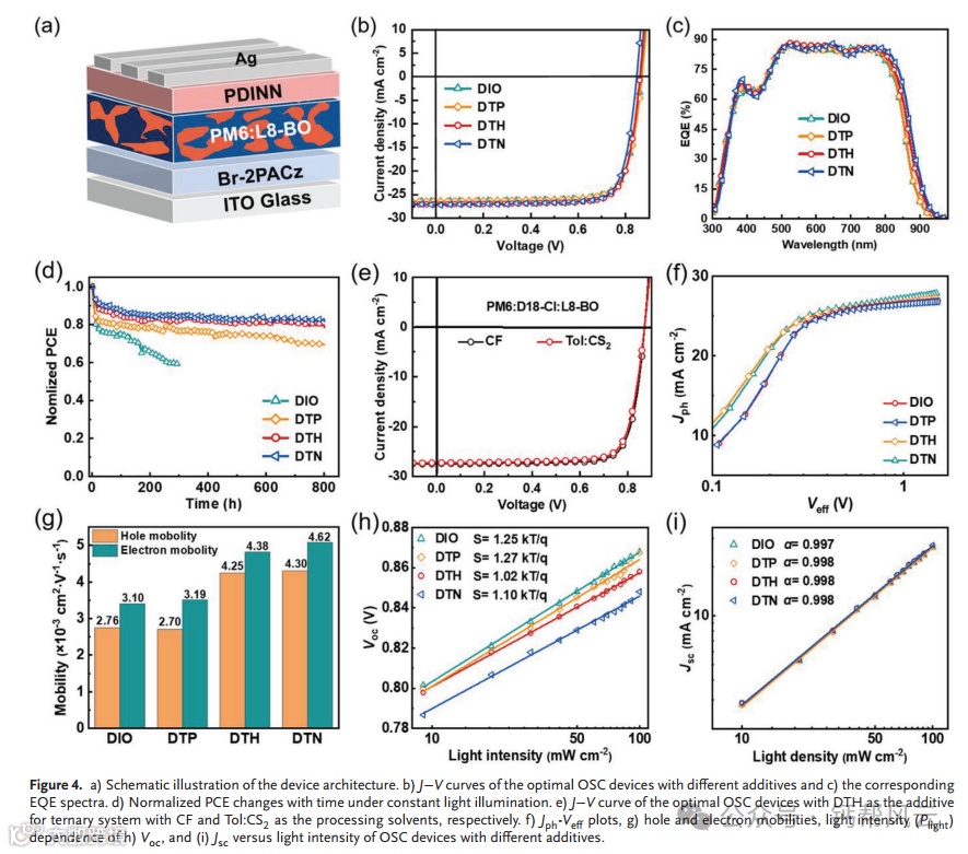 溶剂添加剂是提高有机太阳能电池(OSCs)的形态、效率和稳定性的关键。然而,广泛使用的添加剂1,8-二碘辛烷(DIO)存在有害卤素含量和潜在的盐降解等缺点。为了解决这些问题,介绍了新型的非卤化,噻基-烷基-噻基结构溶剂添加剂- dtp, DTH和dtn -分别具有不同烷基连接长度的(CH2)3, (CH2)6和(CH2)9。具有较长烷基连接体的添加剂DTH和DTN均能有效溶解PM6和L8-BO并与之发生强相互作用。这种双重相互作用使它们的微观结构能够精确调整,从而提高结晶度。在OSCs中加入DTH作为添加剂(PM6:L8-BO)后,观察到最小的电压损失,导致18.51%的令人惊叹的效率,超过了DIO的17.90%。此外,基于dth的器件表现出优越的光稳定性。在三元共混体系(PM6:D18-Cl:L8-BO)中,效率达到19.07%,优于以前基于非卤化溶剂添加剂的OSCs。此外,采用甲苯和二硫化碳的非卤化加工溶剂组合,PCE高达18.82%。这些结果强调了设计具有芳香和烷基单元的溶剂添加剂的有效性,使其能够与供体和受体进行定制的相互作用,从而提出了优化OSC性能和稳定性的稳健策略。