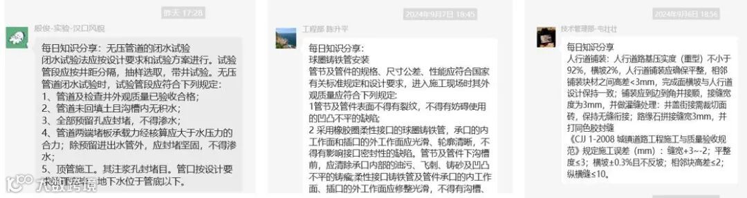 襄阳唐白河双沟枢纽项目、沙颍河航道升级改造项目、陵水安马大道等项目部组织一线工人开展“质量大家谈”活动,围绕“强化工艺纪律,做实质量检验”的主题,开展质量学习研讨活动,强化班组建设,活动过程中,项目部着重强调了工序三检程序、常见质量通病及验收关键控制点等,并对班组之间的疑问及需协调的问题一一进行答复,确保项目生产保质保量的进行。汉口历史风貌区在项目微信工作群每日分项质量知识,营造质量学习氛围。