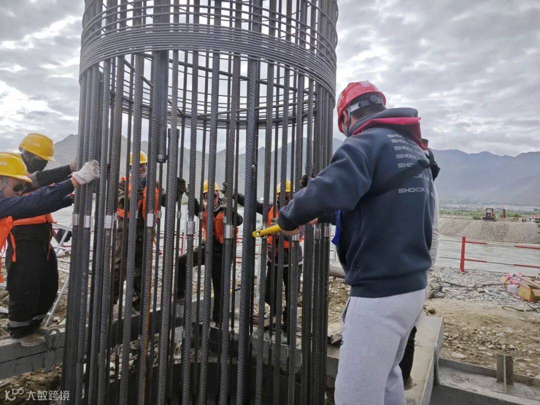 聂当特大桥项目是中交二航局在2024年成功中标的一项新工程,目前正在进行桩基施工阶段。工程部长焦猛和质检部长崔健在对钢筋加工场的钢筋加工工艺及钢筋笼加工质量进行检查后,前往施工现场对工序质量进行检验。当他们检查到引桥时,正值30#-3桩基安装钢筋笼。桩基第一节钢筋笼采用了双层主筋设计,仅一节钢筋笼的安装就需要拧紧206根钢筋套筒,这使得作业量十分巨大。由于空间狭窄,内层钢筋的操作难度较高,超出普通单层钢筋笼一倍多。因此,钢筋机械连接车丝和套筒拧紧的时间消耗很长,这对现场安装工人的体力和耐心是一次极大的考验。