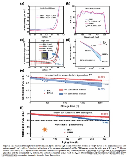 通过空气印刷工艺获得精确的垂直分布有源层形态是实现高效可扩展大面积有机太阳能电池(OSCs)的关键。在这个目标中,通过生态友好的制造方法,在PM6:BTP-eC9薄膜下预沉积D18-Cl层,开发了理想的、可控的具有合适相分离的伪平面异质结(PPHJ)活性层结构。D18-Cl的加入调节了分子结晶,形成了理想的垂直分层,同时抑制了电压损失,优化了能量紊乱和载流子管理。令人印象深刻的是,与BHJ器件相比,最佳PPHJ器件的功率转换效率(pce)分别为19.05% (100 nm)、17.33% (300 nm)和14.14% (4 cm2)。重要的是,PPHJ OSCs还表现出令人印象深刻的外推T80(达到初始PCE的80%所需的时间)的长期存储和操作稳定性,以及热稳定性。