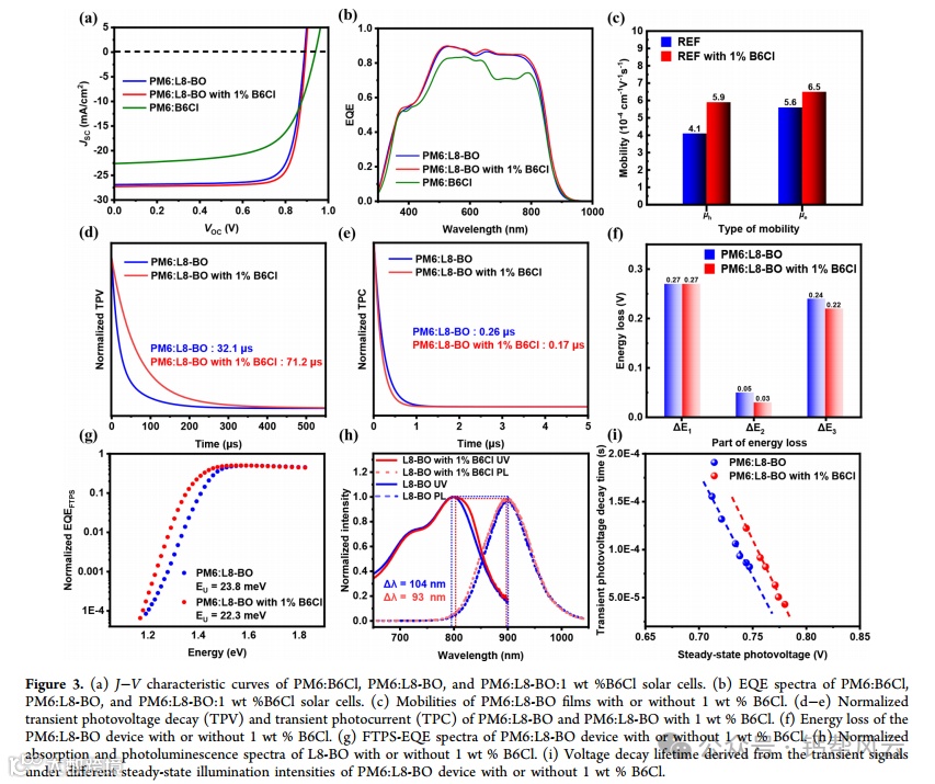 由于有机半导体的聚集引起的亮度猝灭,有机光伏(opv)在有效的电荷输运和抑制的非辐射重组之间进行权衡。为了解决这一巨大挑战,设计了一种在蜂窝网络中具有大空隙的π扩展非富勒烯受体(NFA) B6Cl,并将其引入光伏系统。我们发现少量(即0.5或1 wt %) B6Cl的存在可以压缩宿主受体L8-BO的分子堆积,导致π−π堆积距离从3.59缩短到3.50 Å(这将改善电荷传输)以及有序的烷基链堆积(这将抑制由于抑制C - C和C - H键振动而导致的非辐射能量损失),正如高能x射线散射测量所证实的那样。这种形态转变最终导致opv的JSC、FF和VOC同时提高。结果表明,PM6:L8-BO和D18:L8-BO的最大pce分别从19.1和19.3%提高到19.8和20.2%,是单结opv中最高的。B6Cl对opv性能的提高在一系列聚合物:NFA opv中得到了进一步的证明。