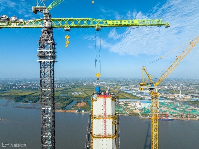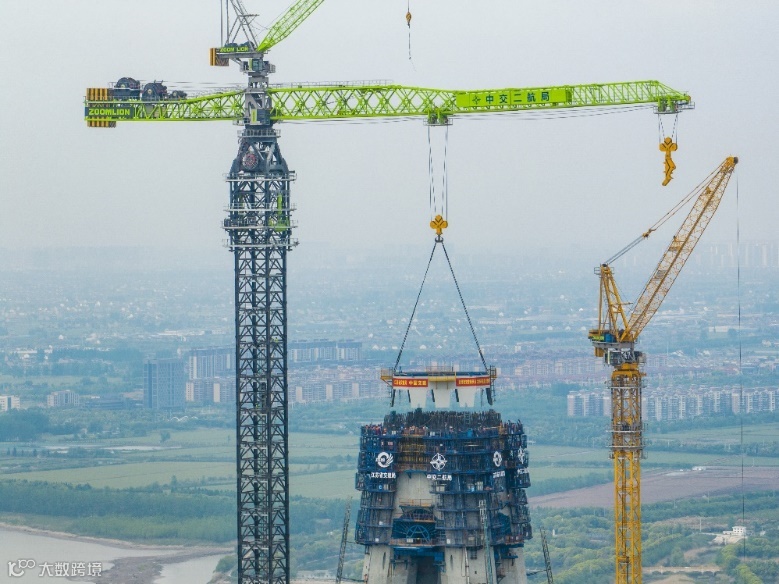 上塔柱钢塔最大块体重量达到220吨,采用世界上首台万吨米级智能化塔吊W12000-450吊装,最大起重能力450吨,研发并应用了主动防碰撞、钢丝绳磨损检测、监测与预警系统和变频回转技术,确保吊装过程安全和高效。研发采用了基于天顶测量相对测控技术,将塔底天顶测量控制点,转移至中塔柱顶面,通过相对测控技术,消除了环境、大型设备索塔线形影响,实现钢塔块体快速定位技术。