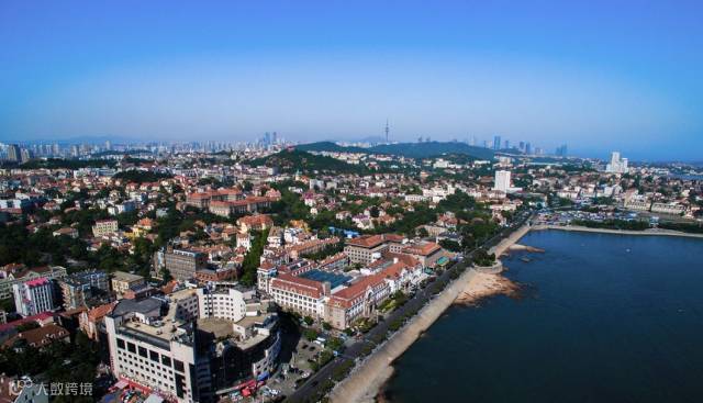 在栈桥上空,可看到青岛红外绿树、碧海蓝天的美景。