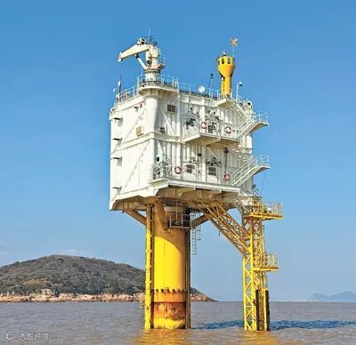 距离秀山岛直线距离26公里之外,普陀山岛与葫芦岛之间海域,还有一座不同形态的潮流能发电平台。这座桩柱式潮流能双向发电设备平台,通过海底电缆,连接着葫芦岛上的岸基集控中心。