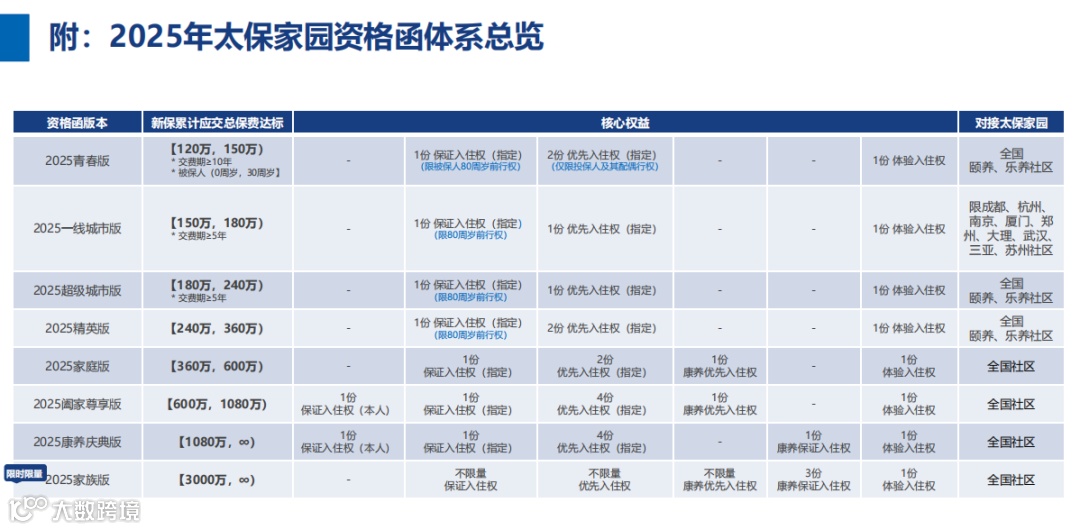 太保家园:总保费≥150万起,可对接太保家园入住资格。