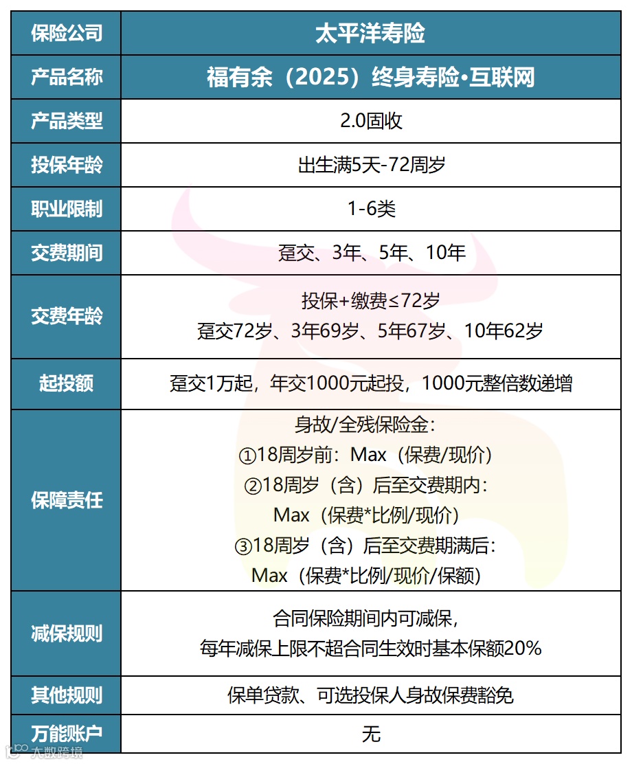 太平洋寿险推出了定价利率2.0%的新产品——福有余(2025)增额终身寿险最近正式上线了。
