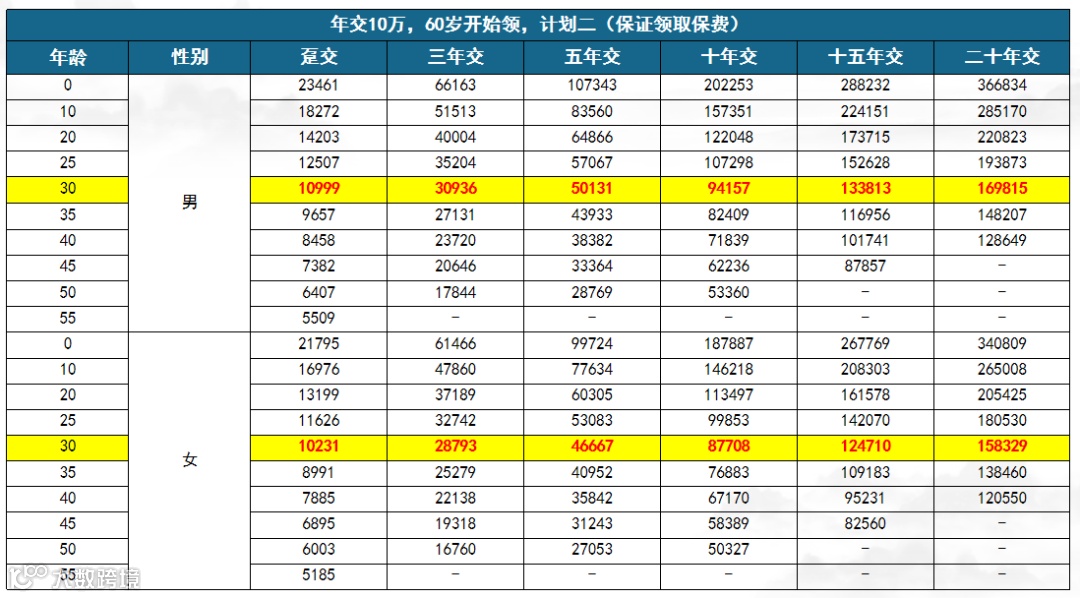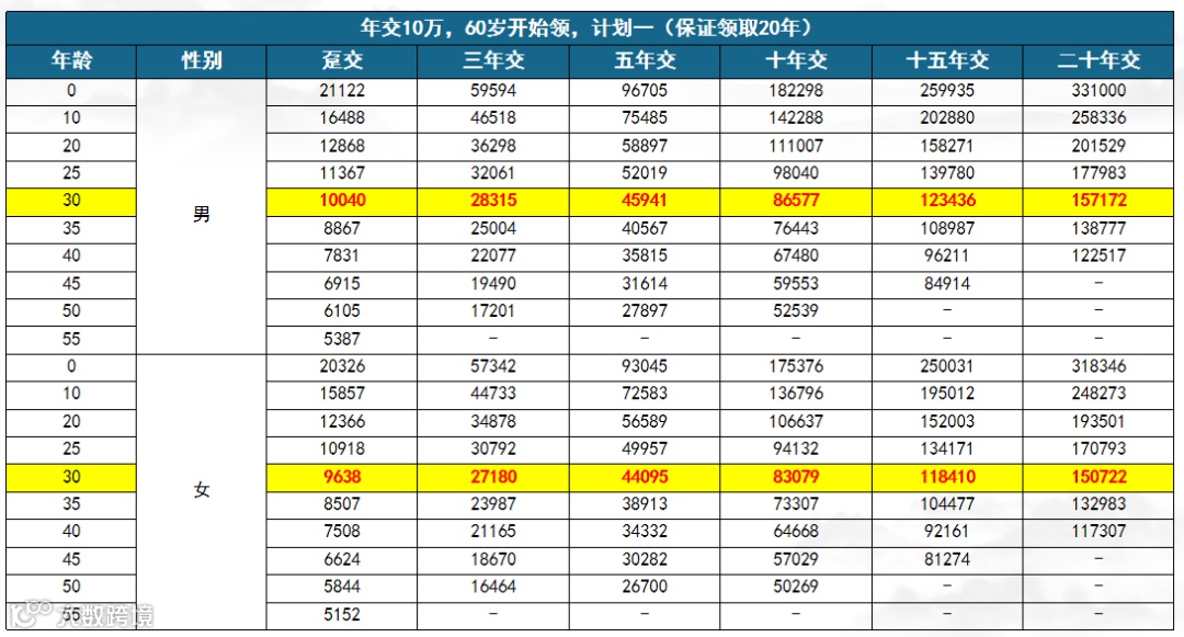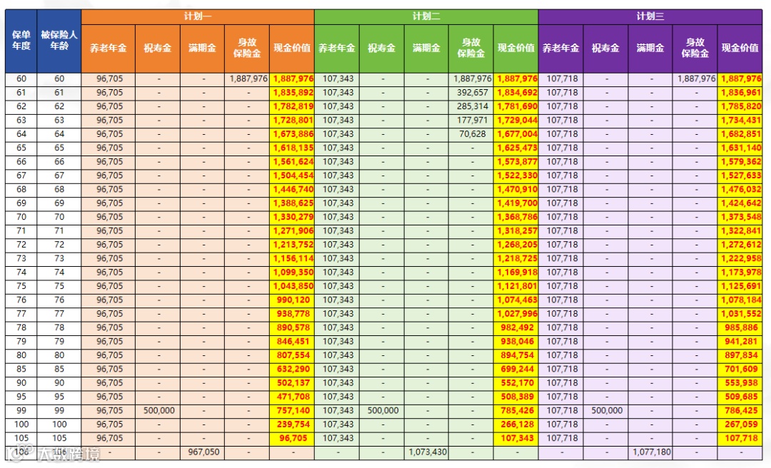 比如,0岁男宝10万5年交,60岁开始领,三个计划领取金额分别是:
