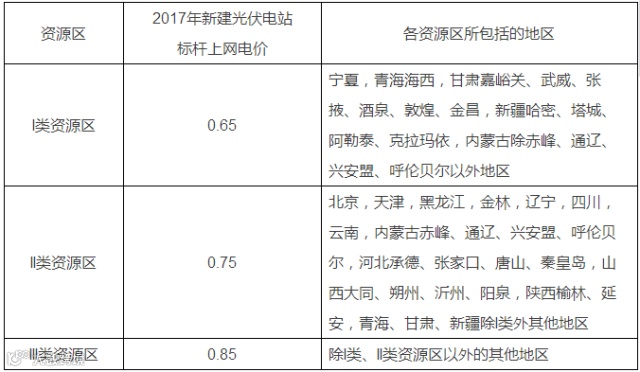 通知规定,2017年1月1日之后,一类至三类资源区新建光伏电站的标杆上网电价分别调整为每千瓦时0.65元、0.75元、0.85元,比2016年电价每千瓦时下调0.15元、0.13元、0.13元。同时明确,今后光伏标杆电价根据成本变化情况每年调整一次。2018年1月1日之后,一类至四类资源区新核准建设陆上风电标杆上网电价分别调整为每千瓦时0.40元、0.45元、0.49元、0.57元,比2016-2017年电价每千瓦时降低7分、5分、5分、3分。