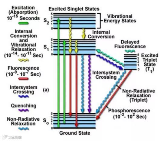 当光照射到荧光分子上时,如果光子能量满足两个能级之间的能量差时,外层处于基态的电子会吸收光子能量,跃迁到激发态。处于激发态的电子是不稳定的,会回迁到基态,在回迁的过程中就会放出荧光。
