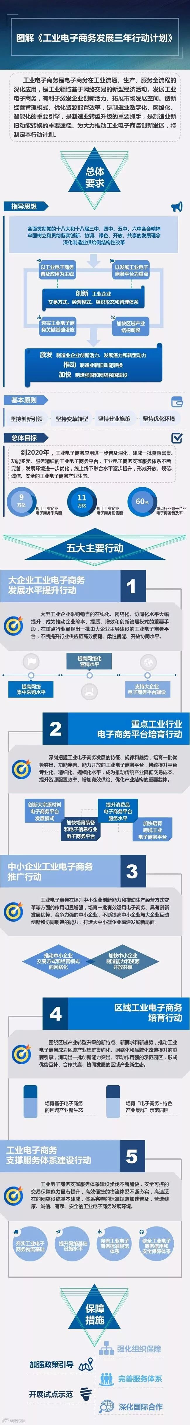 《行动计划》面向政府、大企业、中小企业、平台企业、物流企业、金融机构、行业组织等各类主体,围绕工业电子商务普及应用、平台建设、区域转型、支撑服务体系建设、环境优化等方面,部署了“大企业工业电子商务发展水平行动”“重点工业行业电子商务平台培育行动”“中小企业工业电子商务推广行动”“区域工业电子商务培育行动”“工业电子商务支撑服务体系建设行动”五项主要行动。