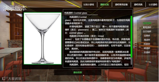 “酒吧调酒虚拟仿真实践教学实训系统”场景以酒吧教室的内部主体为环境,再现了酒品陈列柜、吧台、酒具等酒吧场景元素。通过虚拟仿真和交互的方式,将马天尼、红粉佳人、金费兹等几十种鸡尾酒的调制过程模拟仿真,学生可选择鸡尾酒正确的调制方法、所需配料和计量、调制过程中使用到的工具及鸡尾酒使用的装饰物。系统还包括鸡尾酒基础知识讲解、酒品知识讲解、教学视频等知识内容,涵盖了调酒的多方知识面,学生可以全面的掌握调酒相关的基础知识和专业技能。