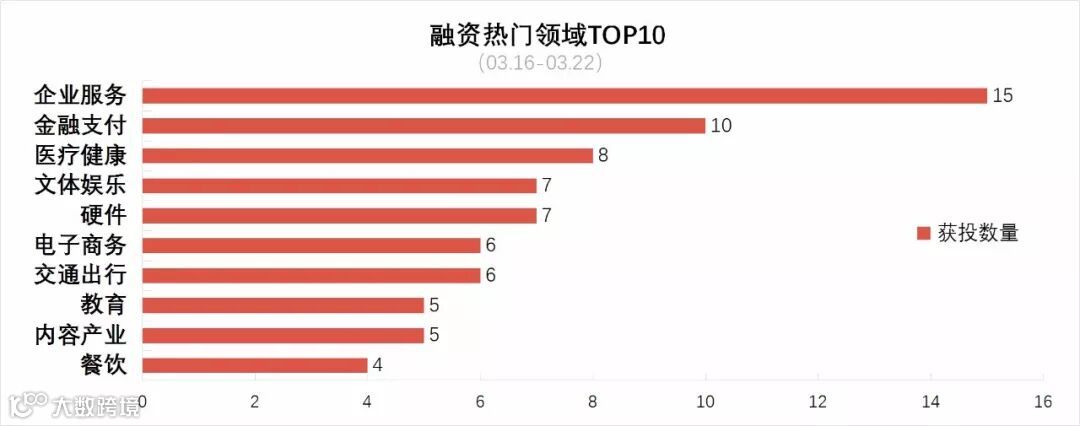 其实,企业服务、硬件和电子商务一直是融资热门领域,即使本周较上周稍显逊色,也还是位居热门前十名。