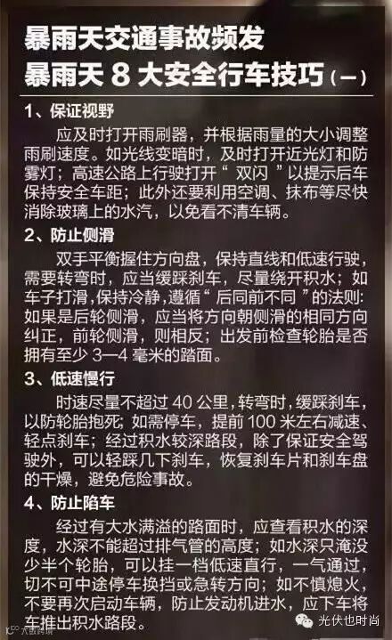到大风暴雨天气开车出行,请保持安全车速,谨慎行车。山区行车须防范道路塌方、泥石流等地质灾害。各位司机朋友们开车出门前,请一定要检查一下雨刮器、刹车、灯光等是否完好。雨天路滑,而且视线不好,如果是新手的话,最好不要开车出门。赶紧戳图了解~~