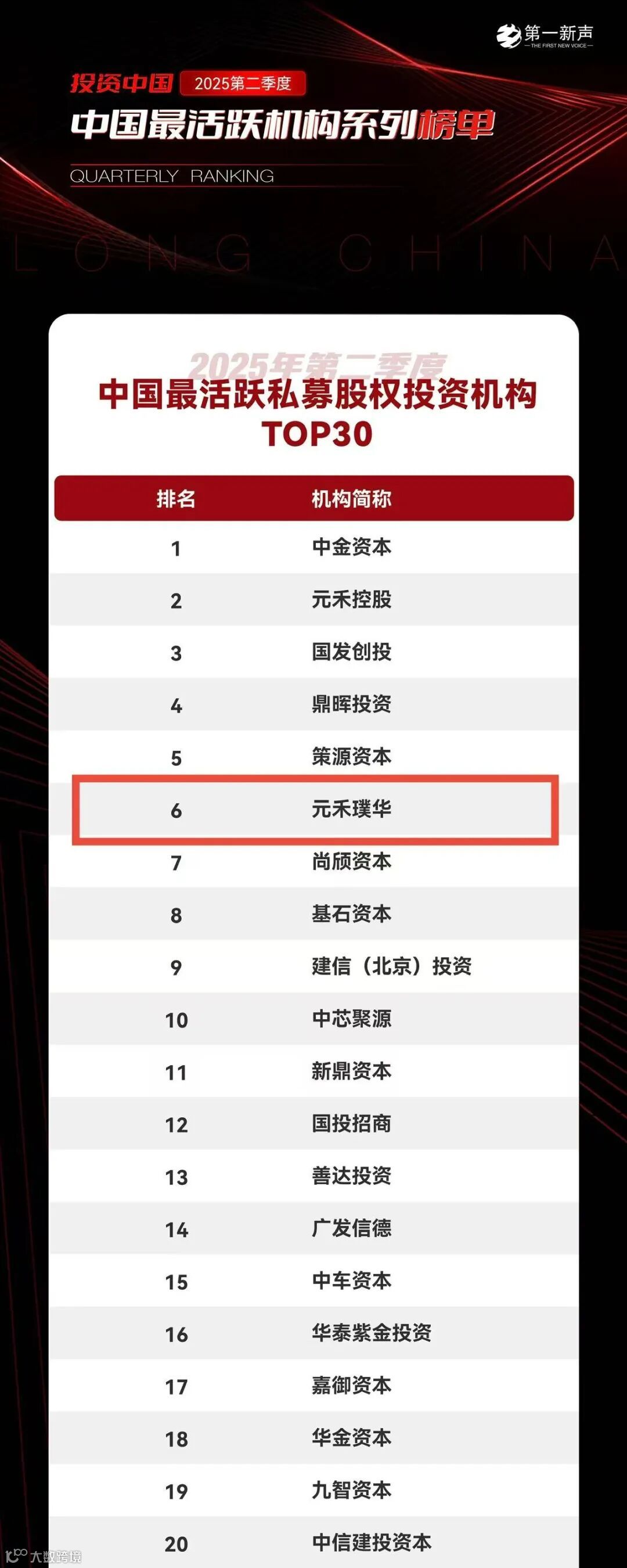 与此同时,在8月14日投资中国发布的2025年第二季度“中国最活跃机构系列榜单”中,元禾璞华荣获“中国最活跃私募股权投资机构TOP30”第6名。