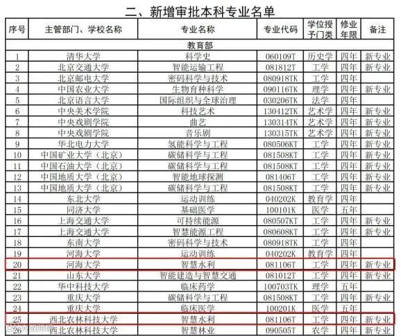 近日,教育部公布了2021年度普通高等学校本科专业备案和审批结果,新增1961个专业点、撤销804个专业点,31种新专业列入《普通高等学校本科专业目录》,列入2022年相关高校本科招生计划。智慧水利与碳储科学与工程、空天智能电推进技术、生物育种科学、资源环境大数据工程、湿地保护与恢复等专业一起,被正式纳入本科专业目录。