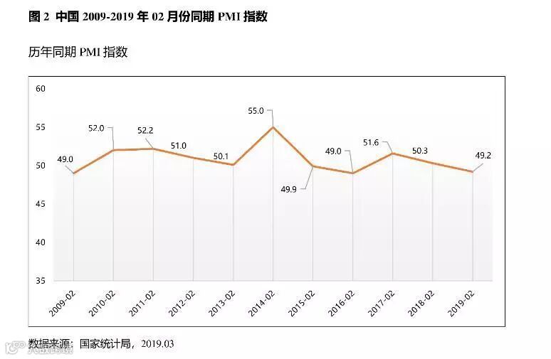 制造业PMI连续3个月低于荣枯线,一季度经济增速或继续放缓。2019年2月份,制造业PMI为49.2%,受春节生产大幅放缓因素的影响,环比回落0.3个百分点,同比下降1.1个百分点。制造业PMI指数连续3个月低于荣枯线,创三年来的低位,表明当前需求下降压力仍然较大,一季度经济增速或继续放缓。从行业表现来看,2月份装备制造业PMI和高技术产业PMI环比均出现回升,在连续2个月运行在50%以下后重回荣枯线上,且都高于制造业PMI。其中,高技术制造业PMI为51.4%,环比增长1.8个百分点。医药制造业和计算机通信电子设备制造业PMI均高于上月和制造业总体水平,增长速度较快,产业结构继续优化。