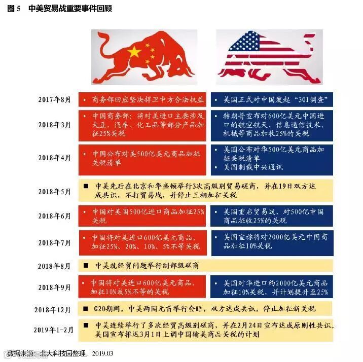 面对中美两大经济体激烈的贸易摩擦,全球经济复苏势头急转直下,世界银行等国际组织认为全球经济前景黯淡,将2019年全球经济增长预期下调至2.9%。2018年12月初G20峰会期间,中美两国元首举行会谈,双方达成共识,不打贸易战,并停止互加征关税的协定。2019年初,基于两国元首达成的共识,中美经贸团队连续举行了多次经贸高级别磋商,并在2月24日宣布达成达成原则性共识。美国随后也宣布推迟3月1日上调中国输美商品关税的计划,国务院关税税则委员会对美方采取的上述措施表示欢迎,中美贸易摩擦趋于缓和。