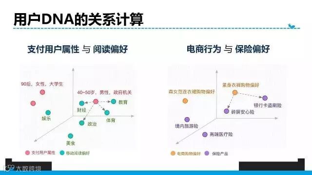 比如资讯阅读能否支付消费,每一个人各个维度都有一个综合的理解。开发一些基于深度学习的技术,蚂蚁DNA,就是一个编码技术。其实很简单,做一个embedding,然后把这个用户实体包括产品,文本和外面的article,我们做一个统一空间里embedding,转来转去有很多点。然后,把这个人在这个点里边直接表达出来。它的好处,比如说加密,如果你只看着点,你是不知道什么意思,但是很多合作方,比如说,我们保险公司合作,把这个用户的数据加密,非常关键的一个问题。