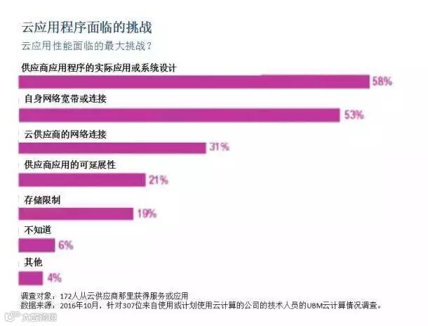 调查对象认为云应用面对的两大挑战是应用程序设计和自己的互联网宽带。完全使用公有云就能够解决这些问题,但试图同时使用公有云和私有云则不行。