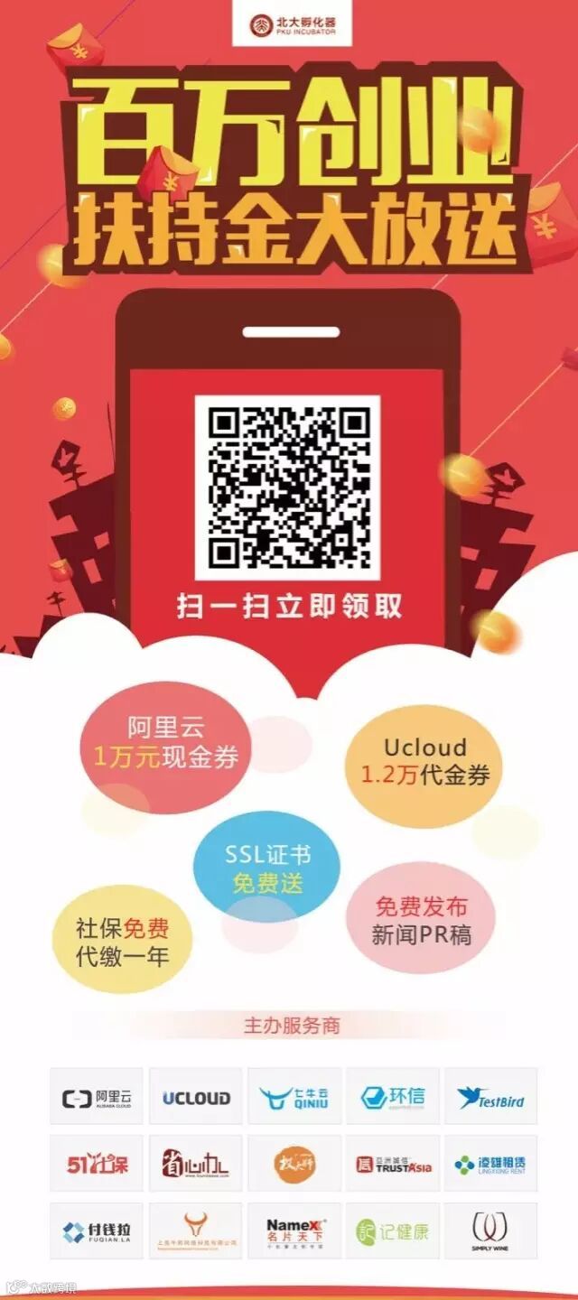 北大孵化器联合15家行业顶级服务商,提供史无前例的创业扶持金,总计发放免费代金券及免费服务价值超百万元。