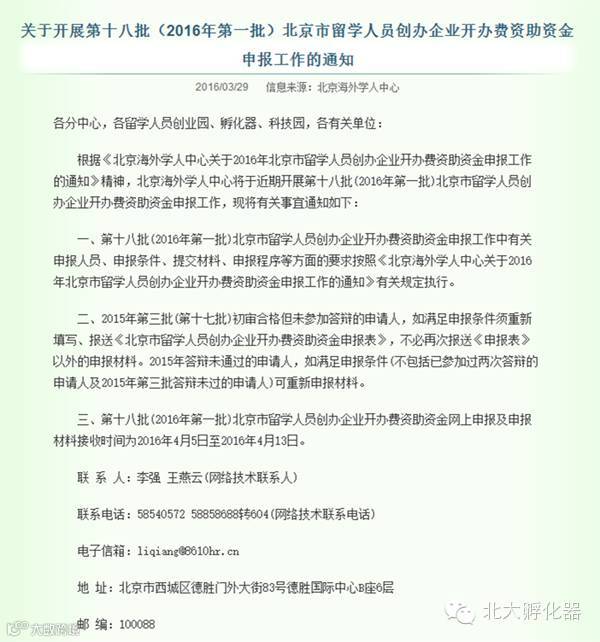 导读:第十八批(2016年第一批)北京市留学人员创办企业开办费资助资金申报工作启动。