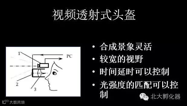 显示技术分为屏幕显示、头盔显示和光场显示。屏幕显示非常好理解。头盔显示目前常用的方式是视频透射式与光学透射式。将自然界真正场景的信号通过摄像机转成数字信号,是用户能很方便地控制真是场景和虚拟场景的结合,但是它成本高,结构复杂。光学透射式与前者不同,它将真实的场景通过投射而不是摄像机呈现在眼内,和虚拟的光线融合后生成虚实结合的场景。采用光学透射式的头盔机构简单、造价低、安全感高、分辨率低从而不会产生眩晕感,这是目前市场上的主流。