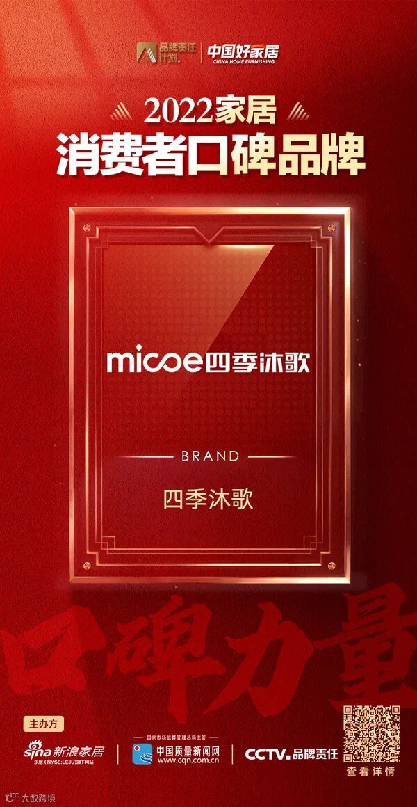 新浪家居携手中国质量新闻网、CCTV品牌责任于3月15日~5月10日,全面开展《中国好家居——2022中国家居消费者口碑调查》活动。本次活动由全国工商联家具装饰业协会、中国建筑装饰协会住宅装饰装修和部品产业分会、中国室内装饰协会、中国建筑材料流通协会、中国木材与木制品流通协会、中国轻工业联合会健康家居专业委员会6大协会全程指导,乐居商学院和家页智库为本次活动提供研究支持。通过广大消费者网络问卷调查,千余名行业专家、设计师及家居从业人员综合评审,四季沐歌荣登2022家居消费者口碑品牌榜。