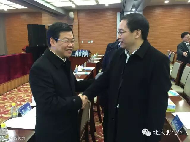 深圳市宝安区区委书记黄敏(左)与北大科技园总裁陈庚(右)合作交流