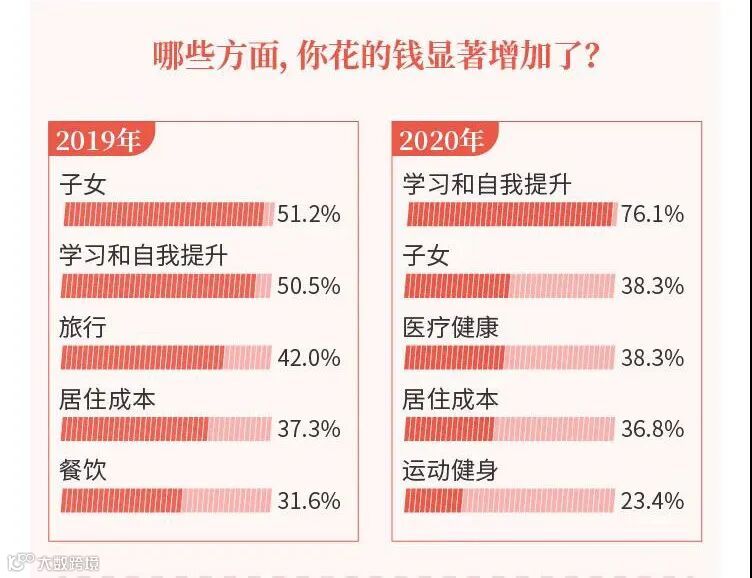 学习和自我提升排在第一位,也许是愈发严重的财富和职业焦虑,正倒逼着新中产为自我学习而付出更多的金钱,这一比例甚至超过了在子女上新增的支出。