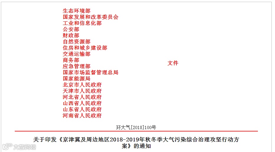 为全力做好2018-2019年秋冬季大气污染防治工作,近日,生态环境部正式发布《京津冀及周边地区2018-2019年秋冬季大气污染综合治理攻坚行动方案》(以下简称《攻坚行动方案》)。