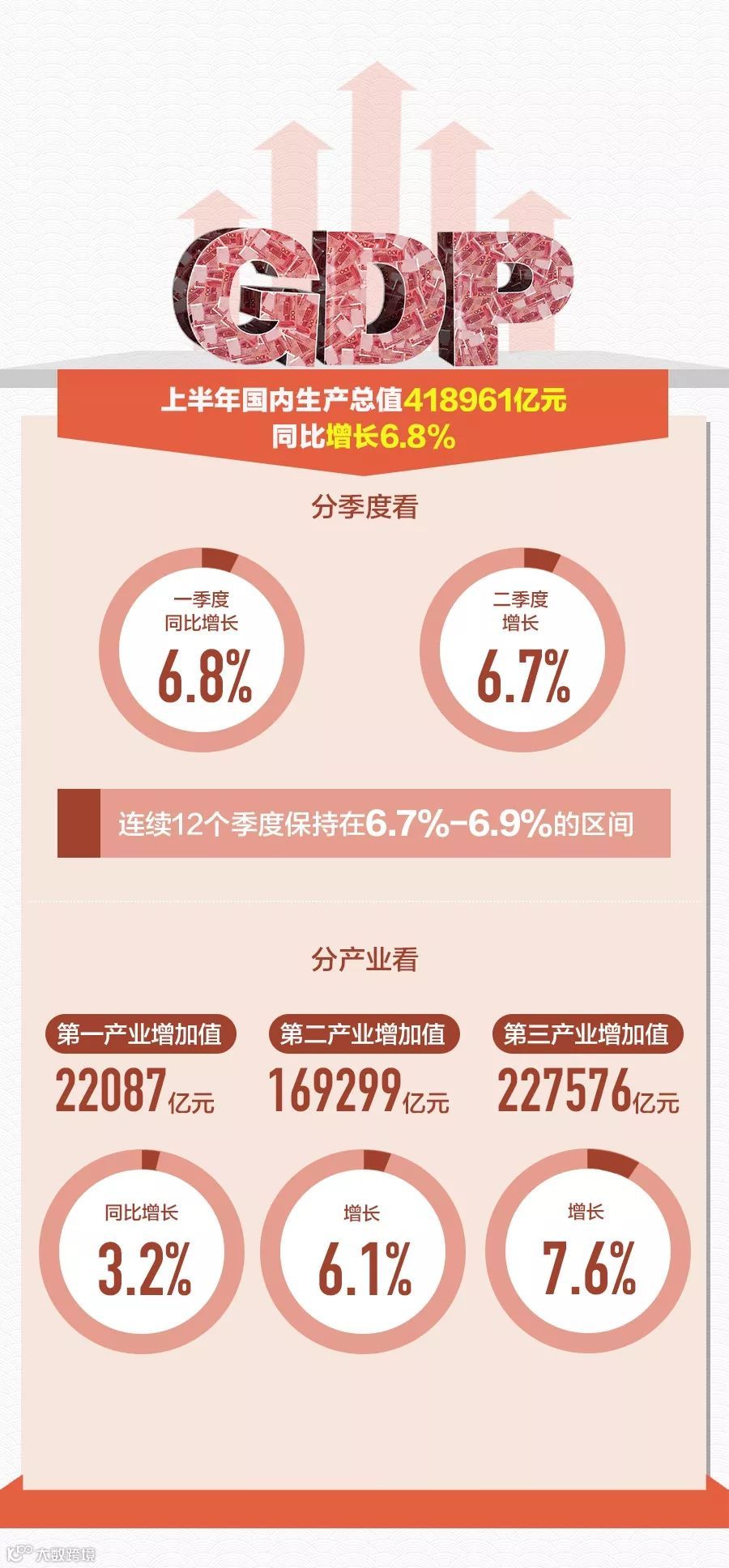 初步核算,上半年国内生产总值418961亿元,同比增长6.8%。其中,第一产业同比增长3.2%,第二产业增长6.1%,第三产业增长7.6%。