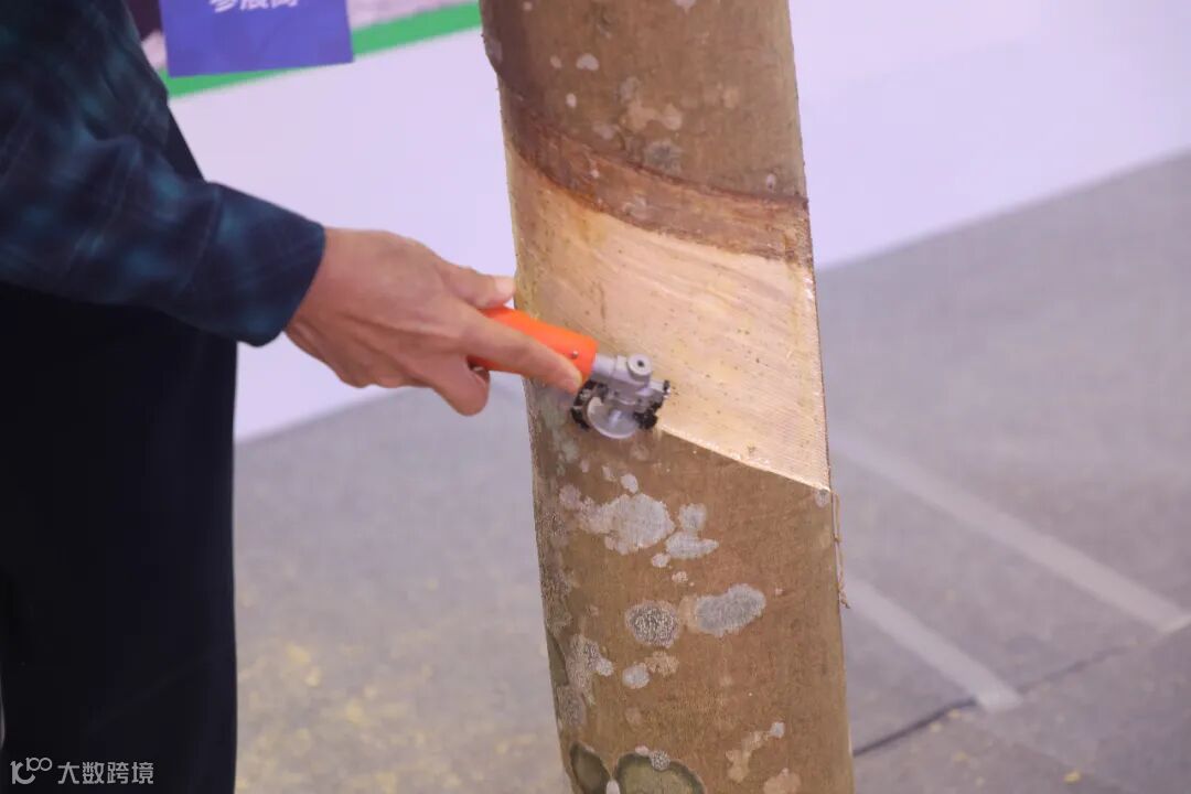 在浙江三锋实业股份有限公司展位上,一款拥有22项专利的锂电采胶机吸引了不少客商驻足。“这款锂电采胶机对比传统采胶机,工作效率提高了30%。”该公司相关负责人表示,自天然橡胶产业诞生以来,一直沿用传统的“点灯割胶”方式,这对胶工技术要求较高,且劳动强度大、时间长。公司瞄准行业痛点和难点,研发了锂电采胶机,并添加了控深装置,可有效降低工人工作强度和采胶技术要求,还能更好的保护橡胶树。