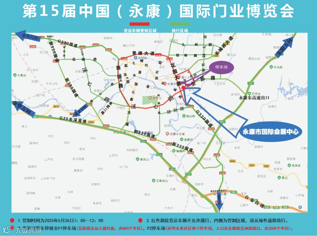 5月26日7:00—5月28日19:00期间,禁止除门业博览会组委会指定车辆外的其他车辆进入永康国际会展中心,禁止车辆在永康国际会展中心周边道路乱停乱放。