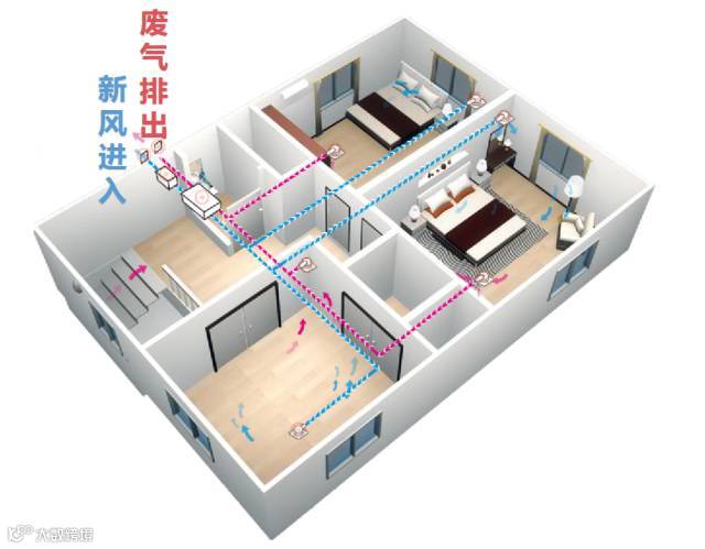 定义通风的路径:室外的新风从卧室、起居室等进入室内,然后由卫浴间、餐厅等易产生污浊空气处排出。