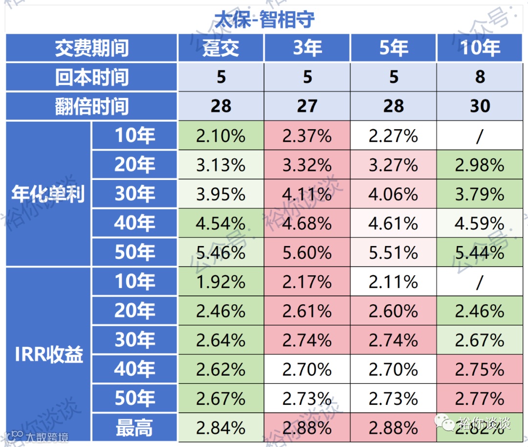 综上所述,太保智相守主力交费期3年和5年,均在第5年实现现金价值>累计已交保费。