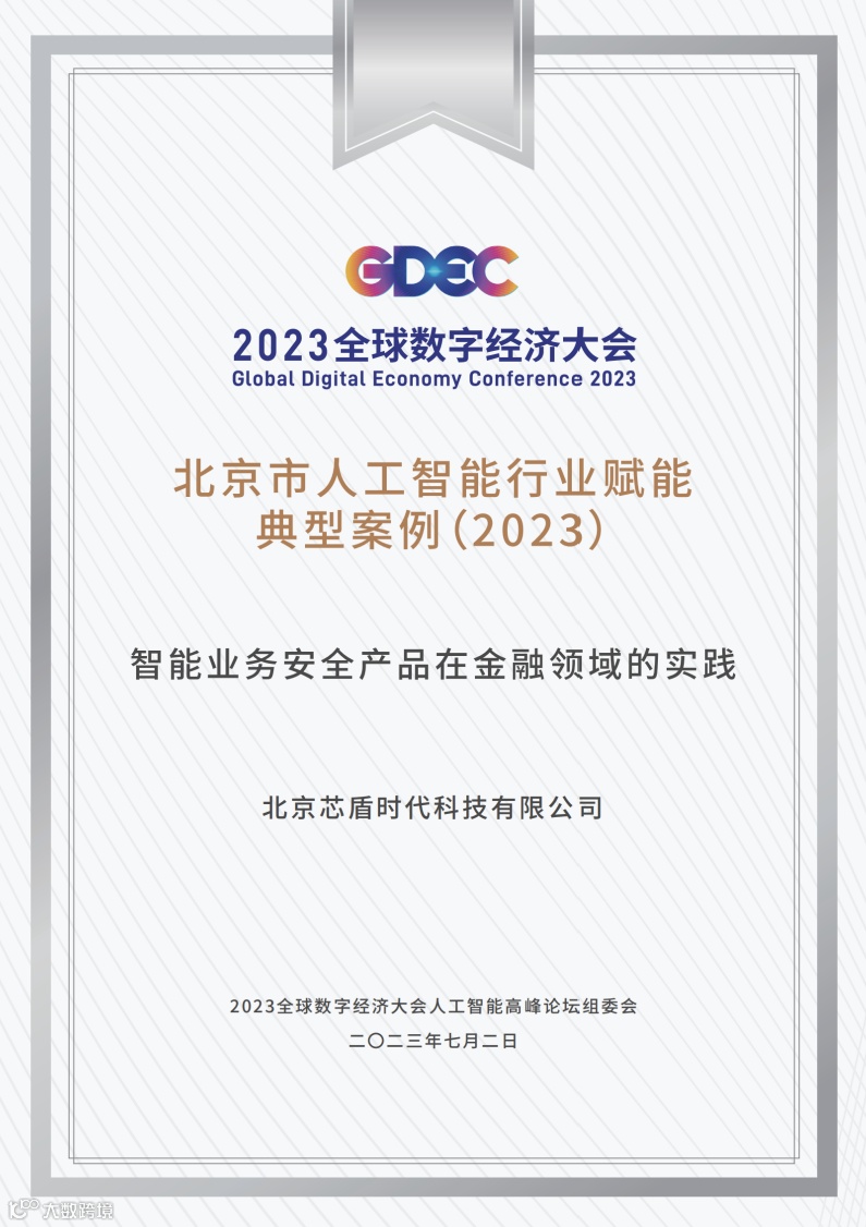 近日,由国家发展和改革委员会、工业和信息化部、科技部、国家网信办、商务部、中国科协联合北京市人民政府共同主办的2023全球数字经济大会人工智能高峰论坛在京举办。会上,北京市人工智能行业赋能典型案例(2023)正式对外发布,芯盾时代“智能业务安全产品在金融领域的实践”获得评审专家的一致认可,从诸多参选案例中脱颖而出,成功入选。