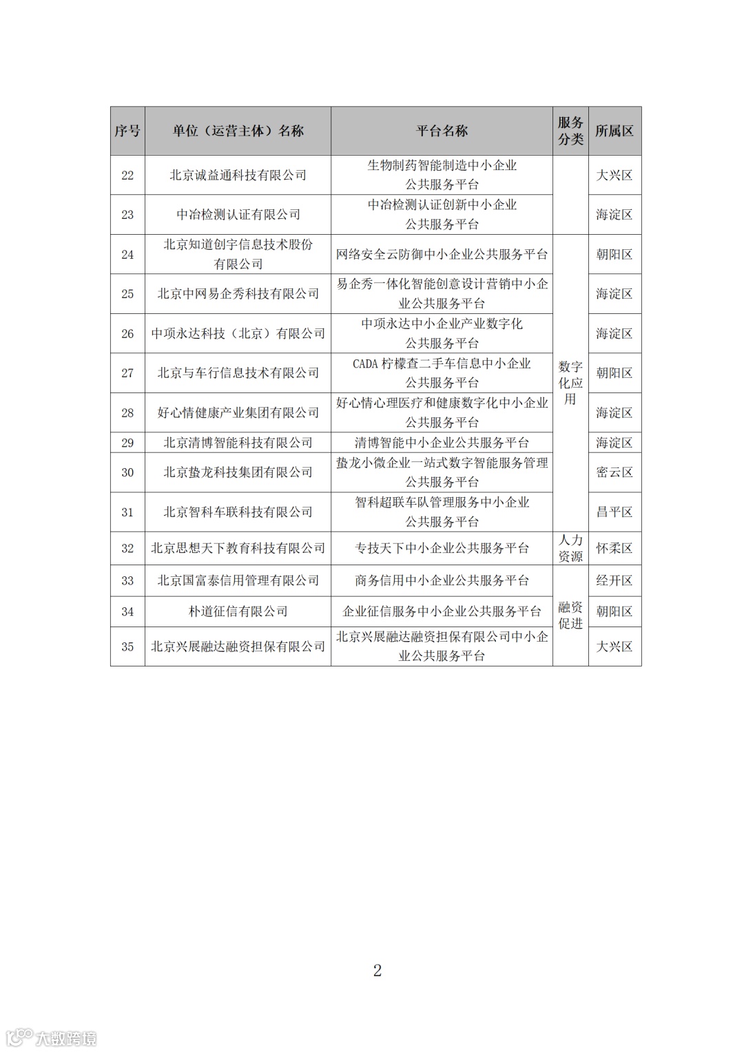 一、同意授予北京金隅文化科技发展有限公司所属“金隅智造工场中小企业公共服务平台”等35个平台为“北京市中小企业公共服务示范平台”(具体名单见附件1)。