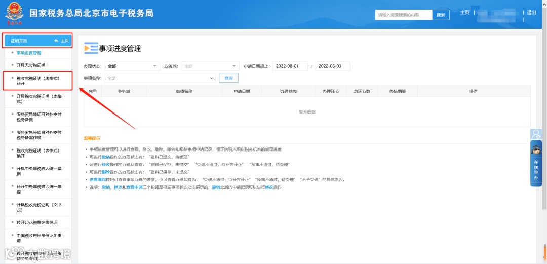 (2)表格式完税证明可通过电子税务局【我要办税】—【证明开具】—【开具税收完税证明(表格式)】查询开具,表格式完税证明仅能开具一次,如需再次打印,可通过电子税务局【我要办税】—【证明开具】—【开具税收完税证明(表格式)补打】模块操作。